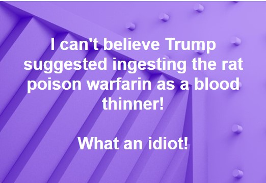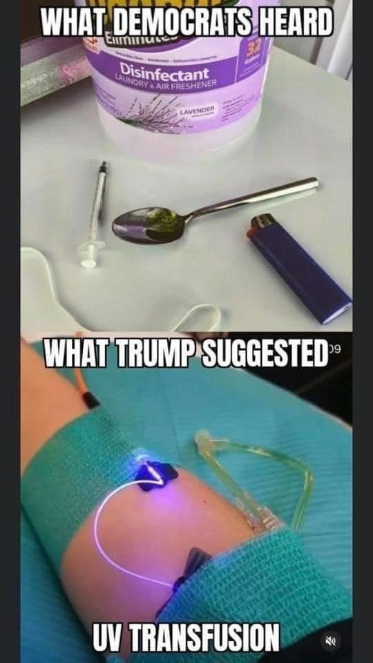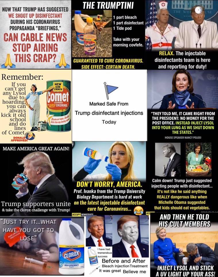 Hoax Phase 7: The memes begin, all with the same message; namely, that Trump told Americans to drink bleach and inject Lysol: