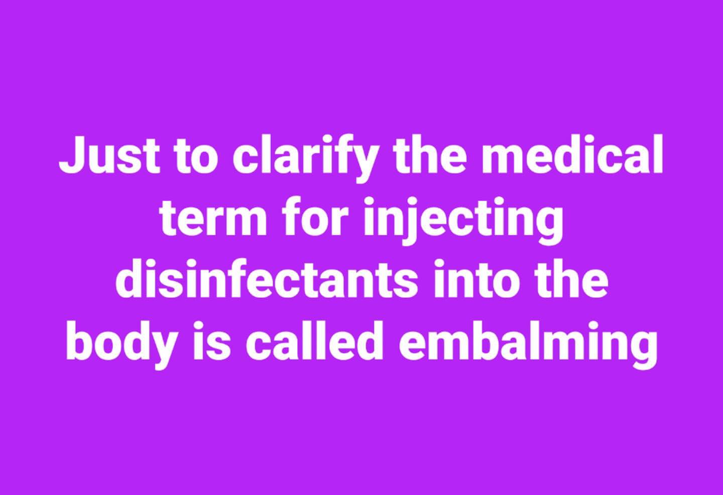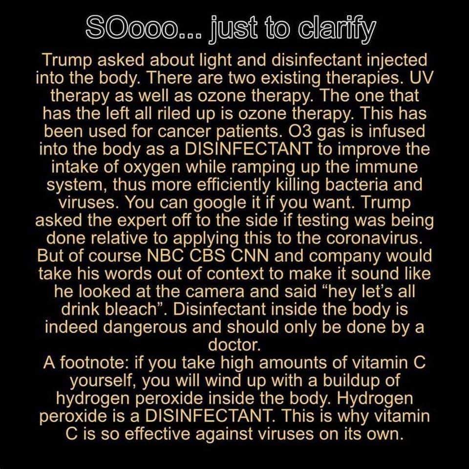 At this point, the hoax is fixed. Conservatives and other people with common sense still try to show that Trump was making a valid point rather than telling people to drink bleach. One line of argument is to point out that people ingest toxins all the time for health reasons:
