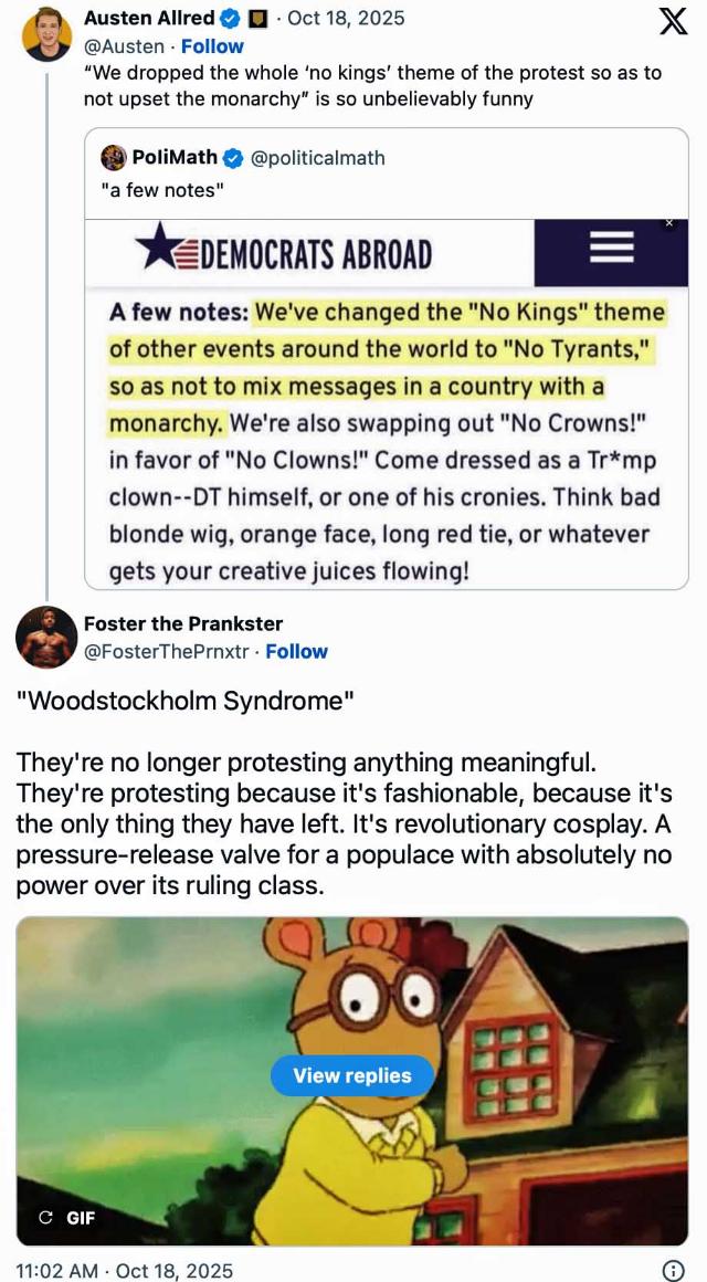 The clueless are useful idiots, people who can be relied upon to participate in political theater. They’ve always voted Democrat just because, and they’re going to believe whatever Democrat “leaders” like AOC, Jasmine Crockett, Gavin Newsom and the Democrat media tell them. Last weekend, many, even most protestors were the white, elderly Democrat base, proving yet again you can’t teach old dogs new tricks—or the reality of the American system of government.