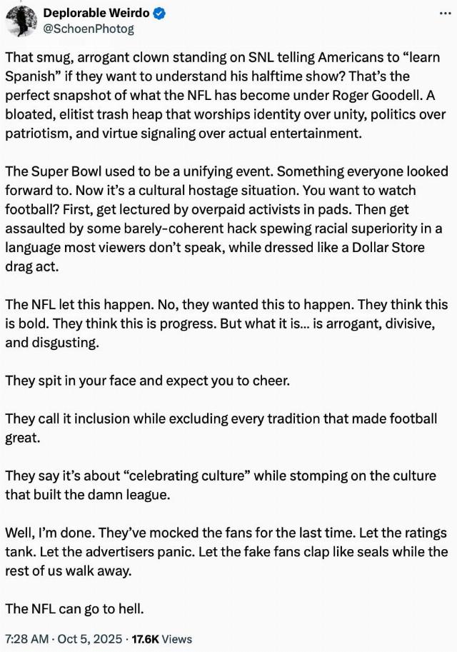 One would think the NFL, which might be aware of the current near-civil war over illegal immigration, particularly since most illegals speak Spanish, would think that kind of arrogant posing rather, well, insulting and even anti-American. But then again, the NFL has nearly a decade of experience at insulting Americans, who by a strange coincidence are the same people providing the NFL’s billions.