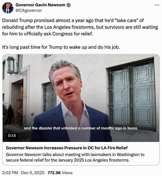 “President Trump’s promise to ‘take care’ of survivors was clearly a lie,” the governor charged. “He isn’t here for the people of Los Angeles, just like he isn’t here for everyday Americans.