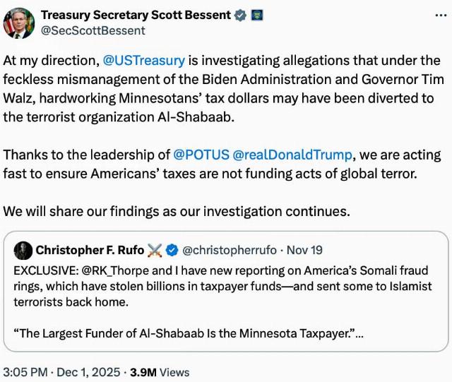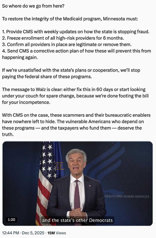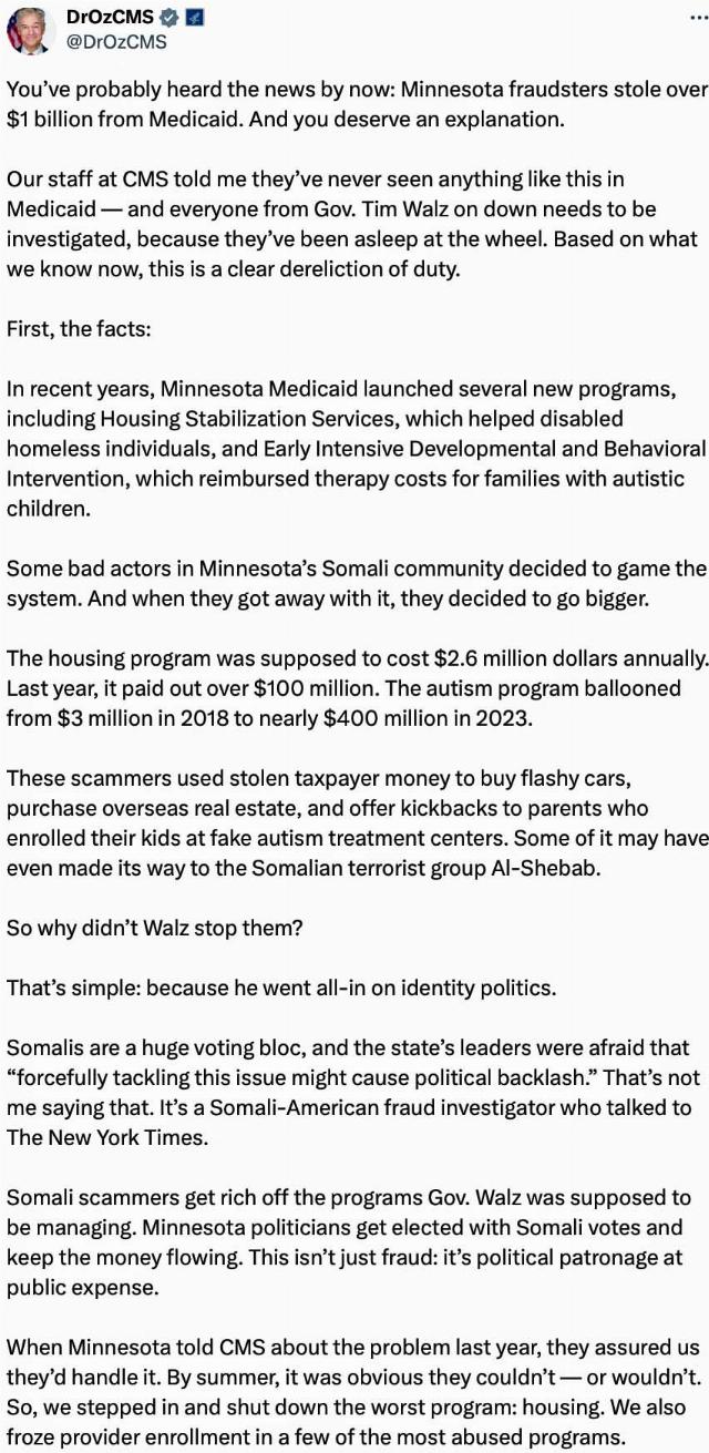 Obviously, Somali criminals among the 100,000 strong Minneapolis Somali enclave quickly recognized an easy opportunity and took increasing advantage of it. They apparently shipped plenty of that money off to their clansmen in Somalia. The largest single funder of Somali Islamist terror group Al-Shabaab now appears to be the Minnesota taxpayer. Dr. Oz addressed the Medicaid fraud allegations on X: