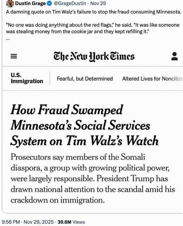 Minnesota also became notorious during the Harris/Walz presidential run as Minnesota Governor Tim Walz was exposed as a serial liar, useful idiot for the Chinese Communist Party, and a particularly incompetent politician and governor. That’s a distinction that has blossomed with the revelation of massive fraud—the “Feeding Our Future” scandal--reaching as high as two billion dollars, largely perpetrated by Minnesota’s Somali population, the largest in America. That round of arrests doesn’t tell the full story.