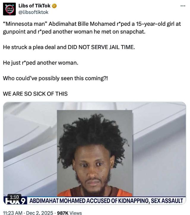 “The allegations are sickening – multiple kidnappings and rapes, including against minors – and they happened in a state that has chosen ideology over public safety. Minnesota’s radical soft-on-crime policies created an environment where predators believe they can act without consequence. President Trump was elected to restore law and order, and under Attorney General Bondi, this Department is making sure violent criminals like this will face real justice and spend the rest of their natural lives in federal prison,” said Deputy Attorney General Todd Blanche.